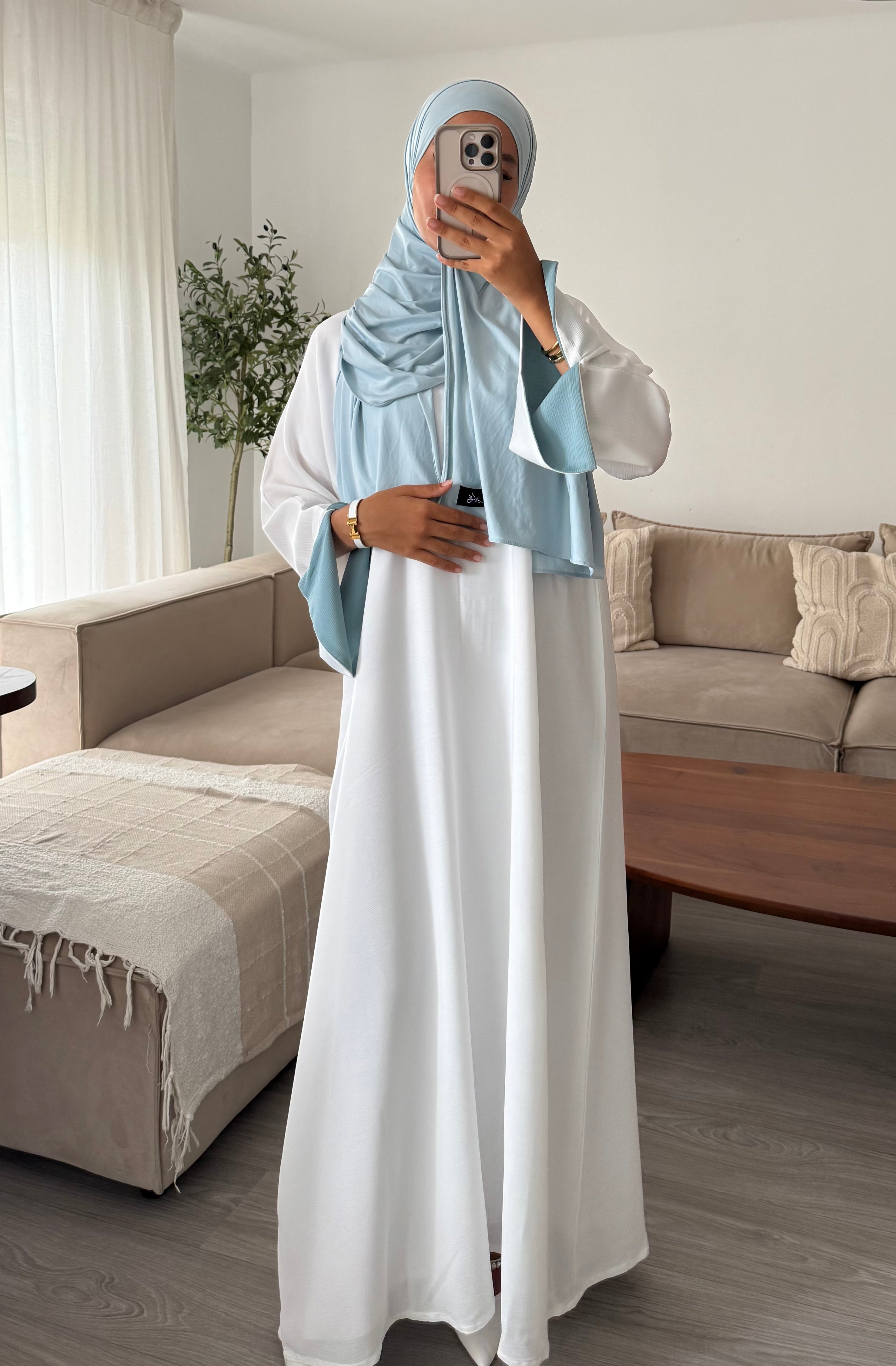 • Associée à un hijab bleu pastel, elle crée une harmonie douce et très tendance